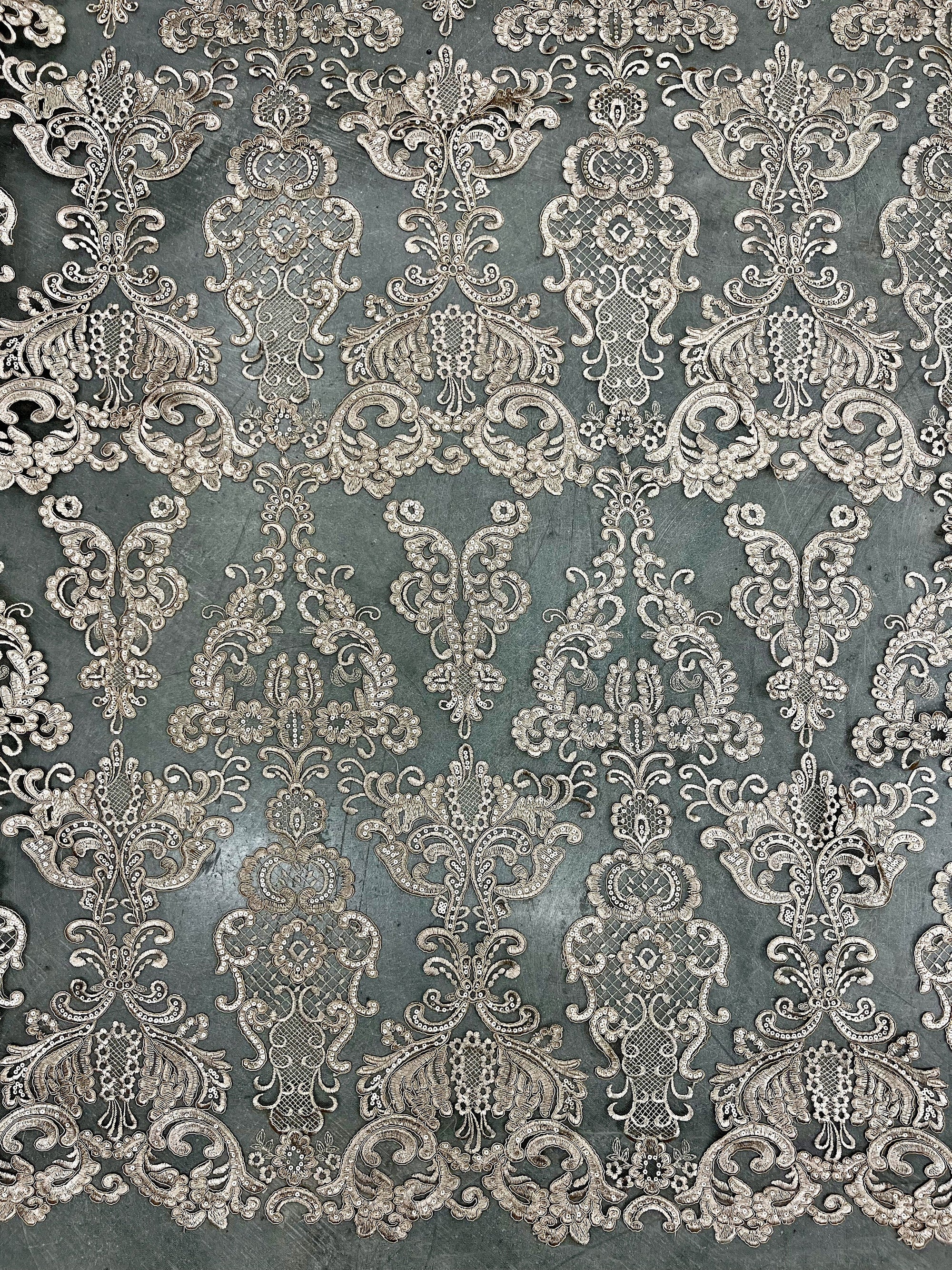 Stand out magnificently as you gracefully appear wearing this stunning lace fabric. Intricate embroidery adorns this fabric, with some sequins scattered all throughout, giving it a lavish and regal feel.
