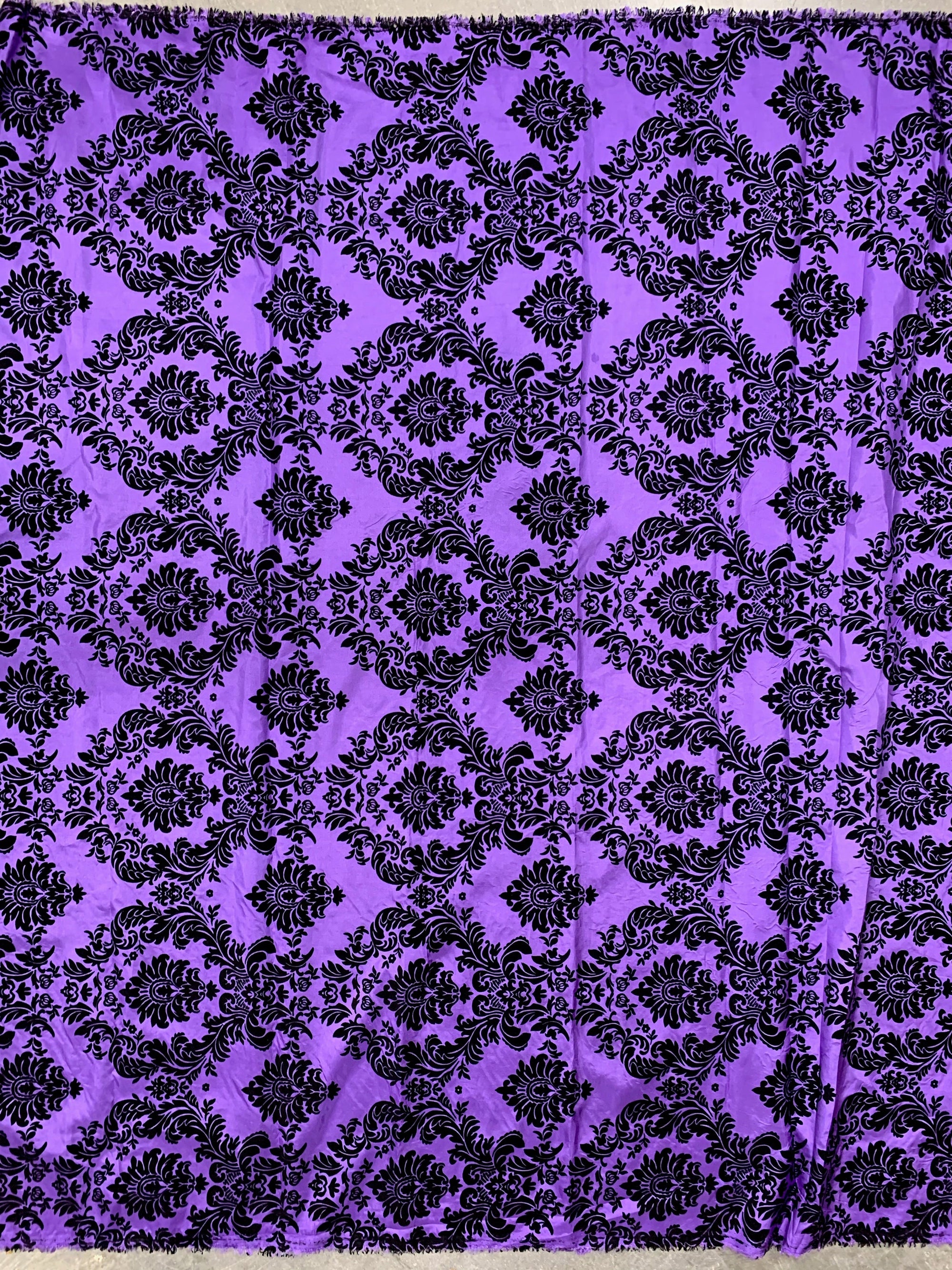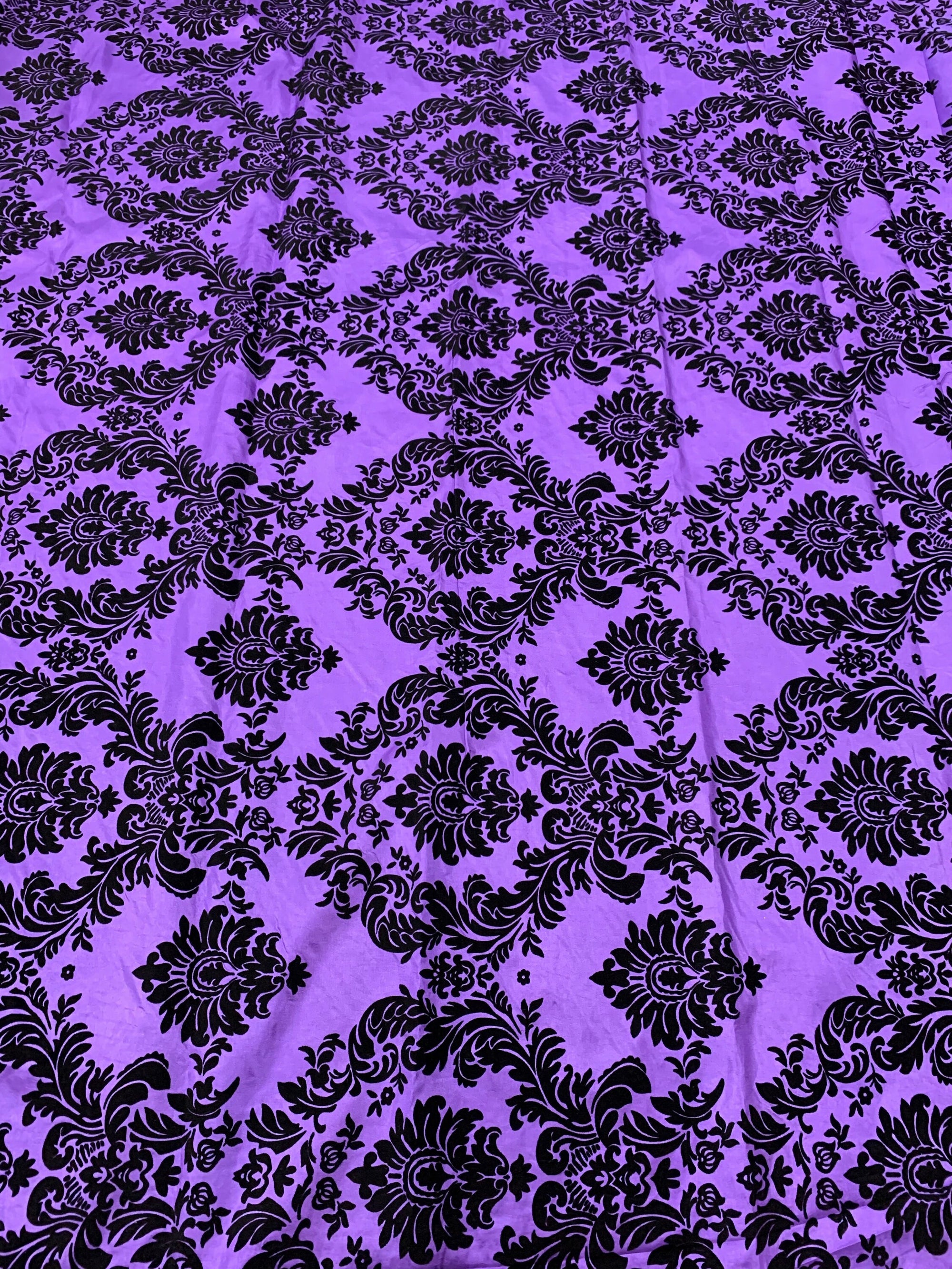 Amanda PURPLE Taffeta with Black Velvet Flocked Damask Fabric by the Yard - 10078